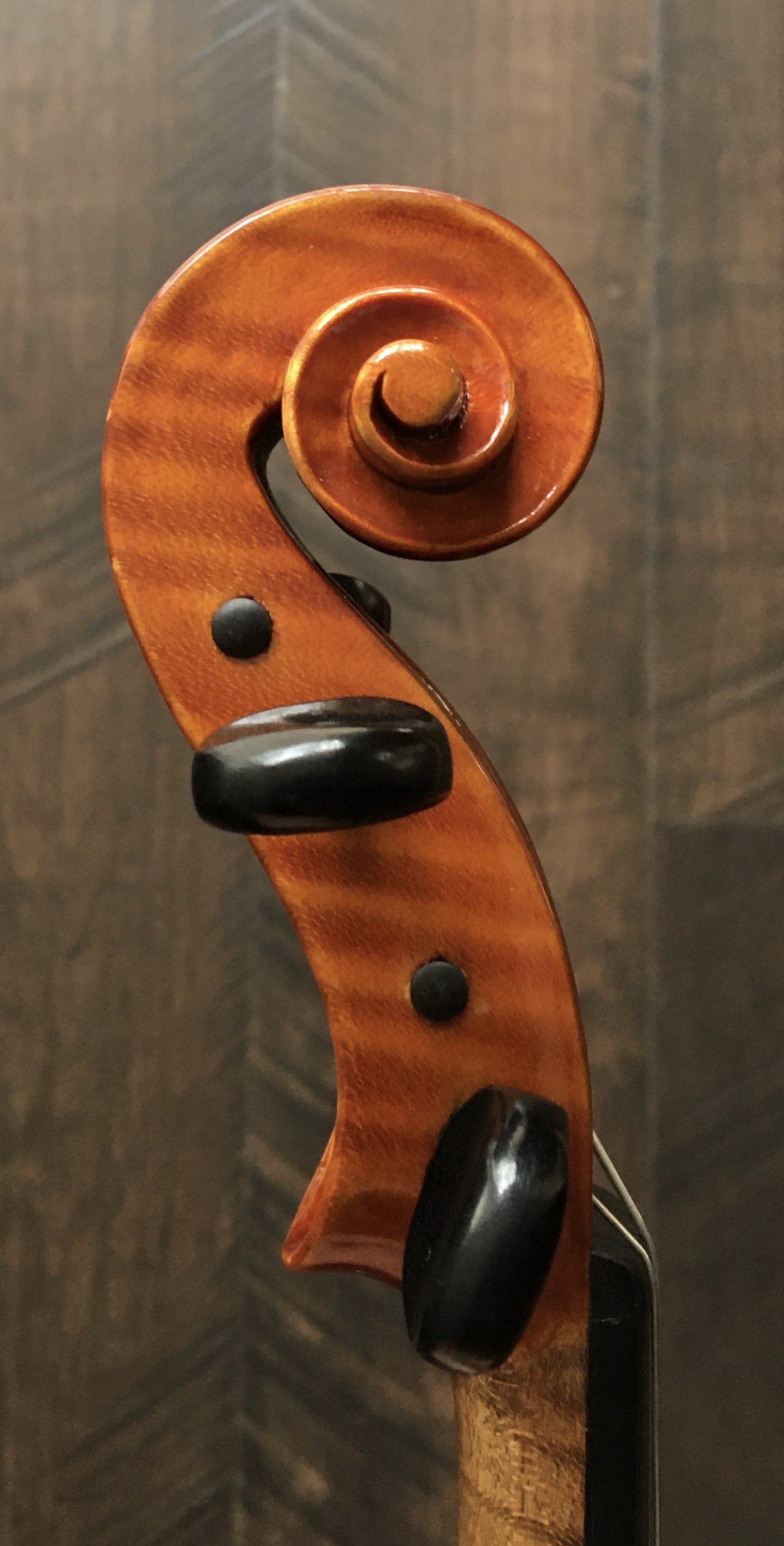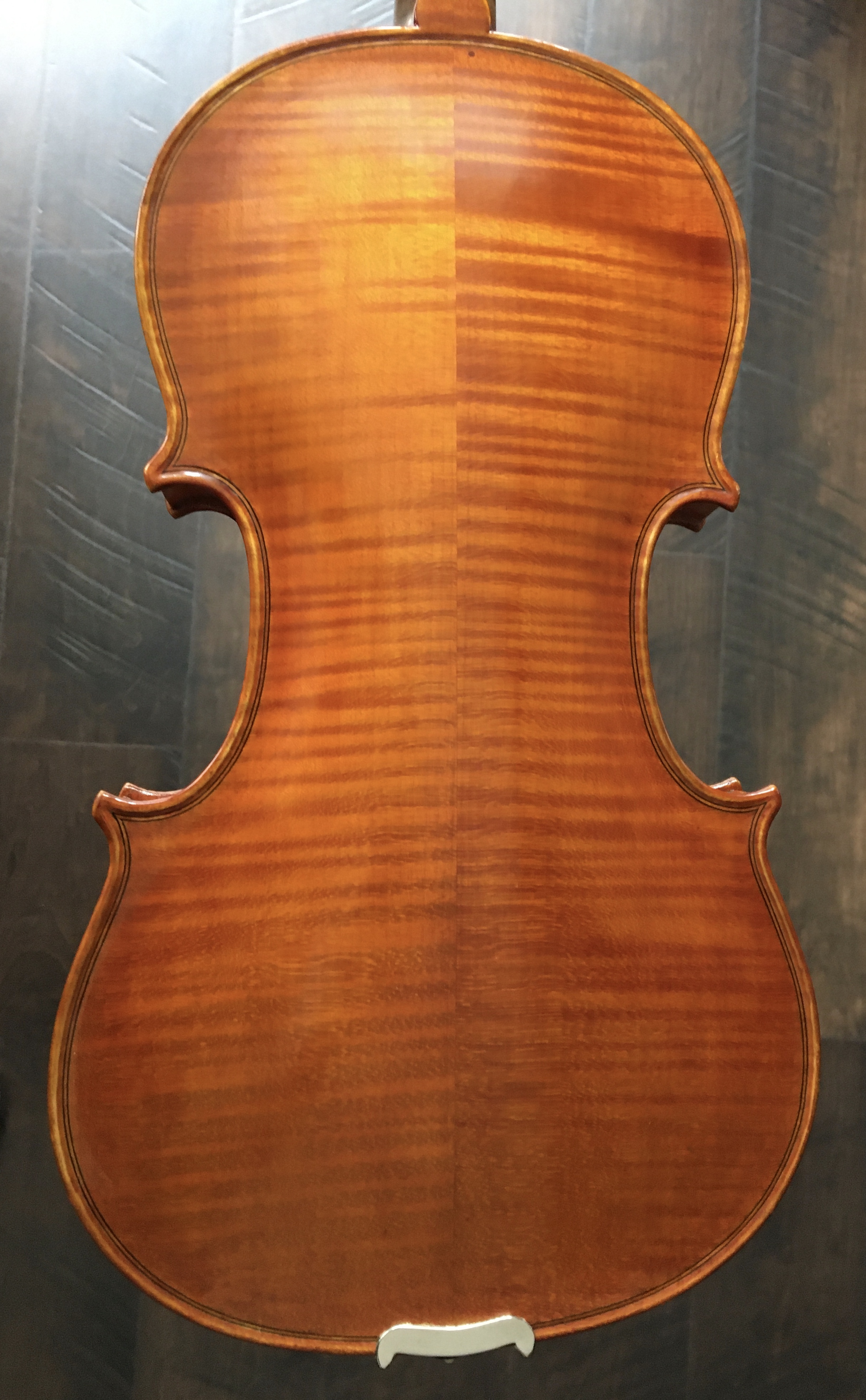 -2-piece maple back, attractive narrow flame descending very slightly from the joint -Ribs and scroll of similar maple -2-piece spruce matched top of medium width at the joint, widening rapidly to the...