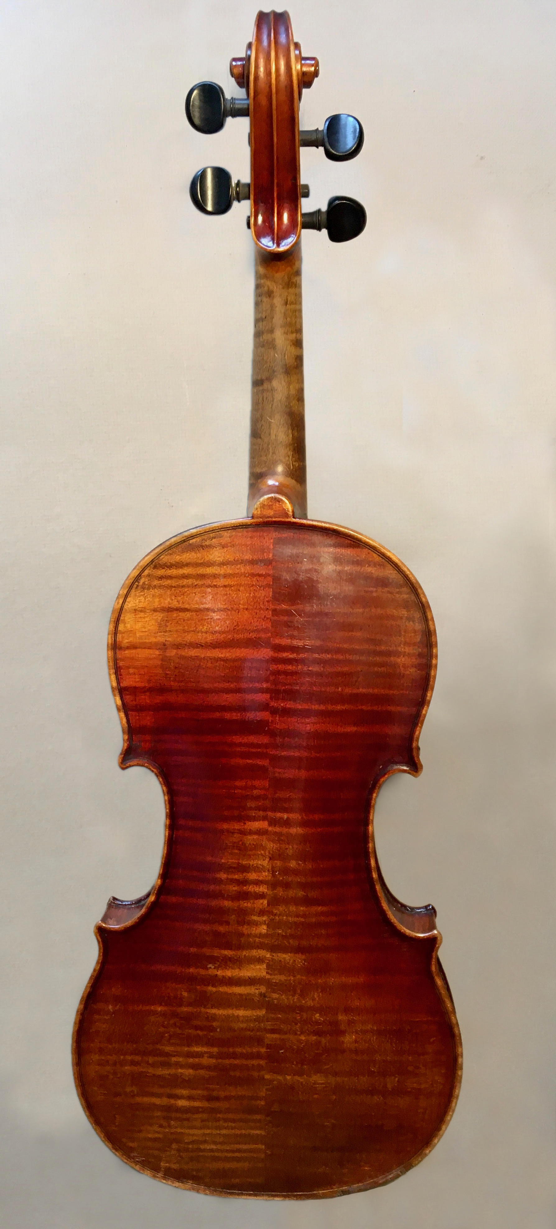 -2-piece back, horizontal medium flame maple -Ribs of narrower flame (maple) -Scroll of less distinct figured maple -Top made of 2 pieces of spruce with strong medium grain -Varnish is antiqued/shade...