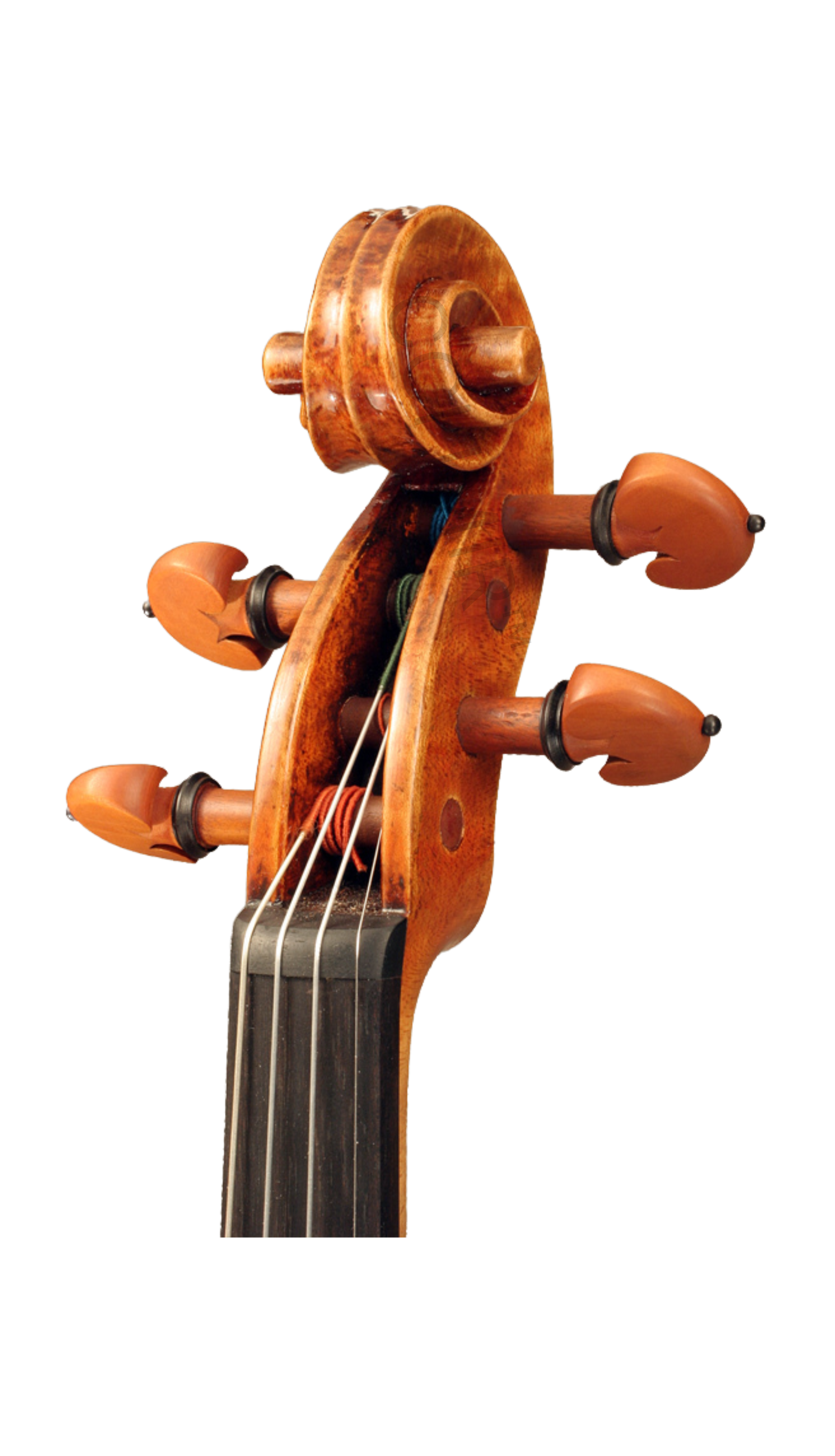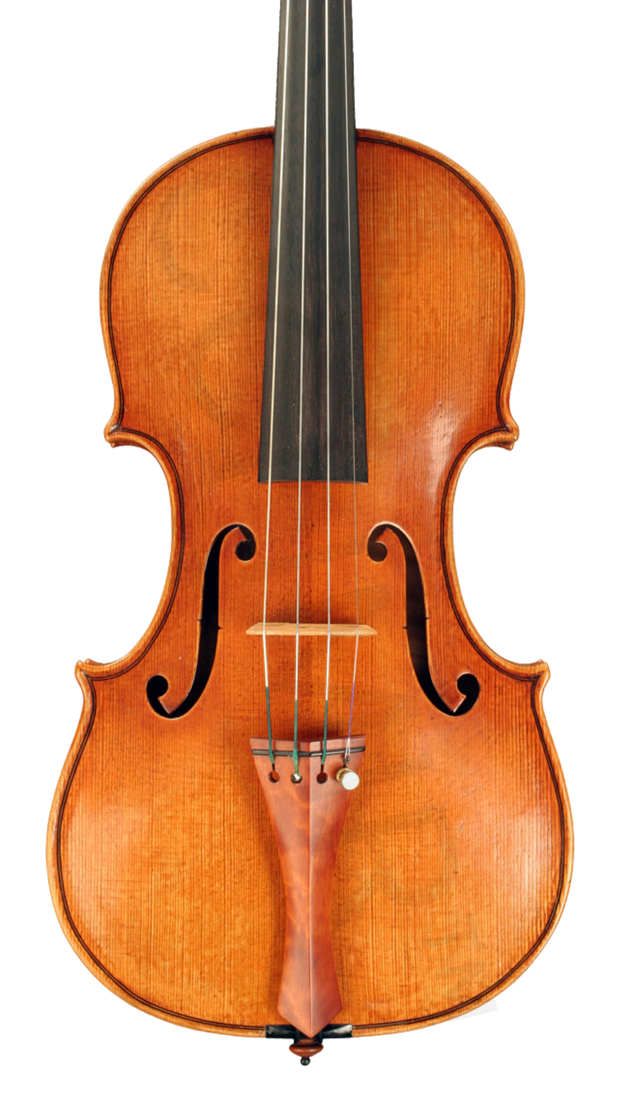This violin is made from a personal Guarneri "del Gesu" Ole Bull model using a two-piece back cut on the quarter from strongly flamed maple. The curl is of medium to broad and descends from the center...